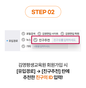 · 추천받은 친구가 가입 시 친구추천 입력란에 추천친구 ID를 기재하지 않을 경우, 이벤트 참여로 인정되지 않으며 차후 수정이 불가합니다.