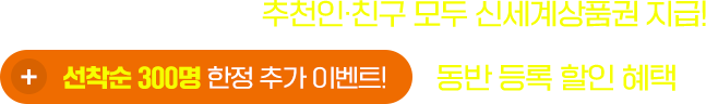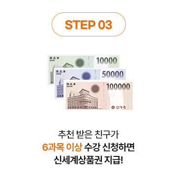 · 소개받아 등록한 신규 수강생에게는 중간고사 종료 후, 신세계백화점 1만원 상품권 모바일로 발송됩니다.